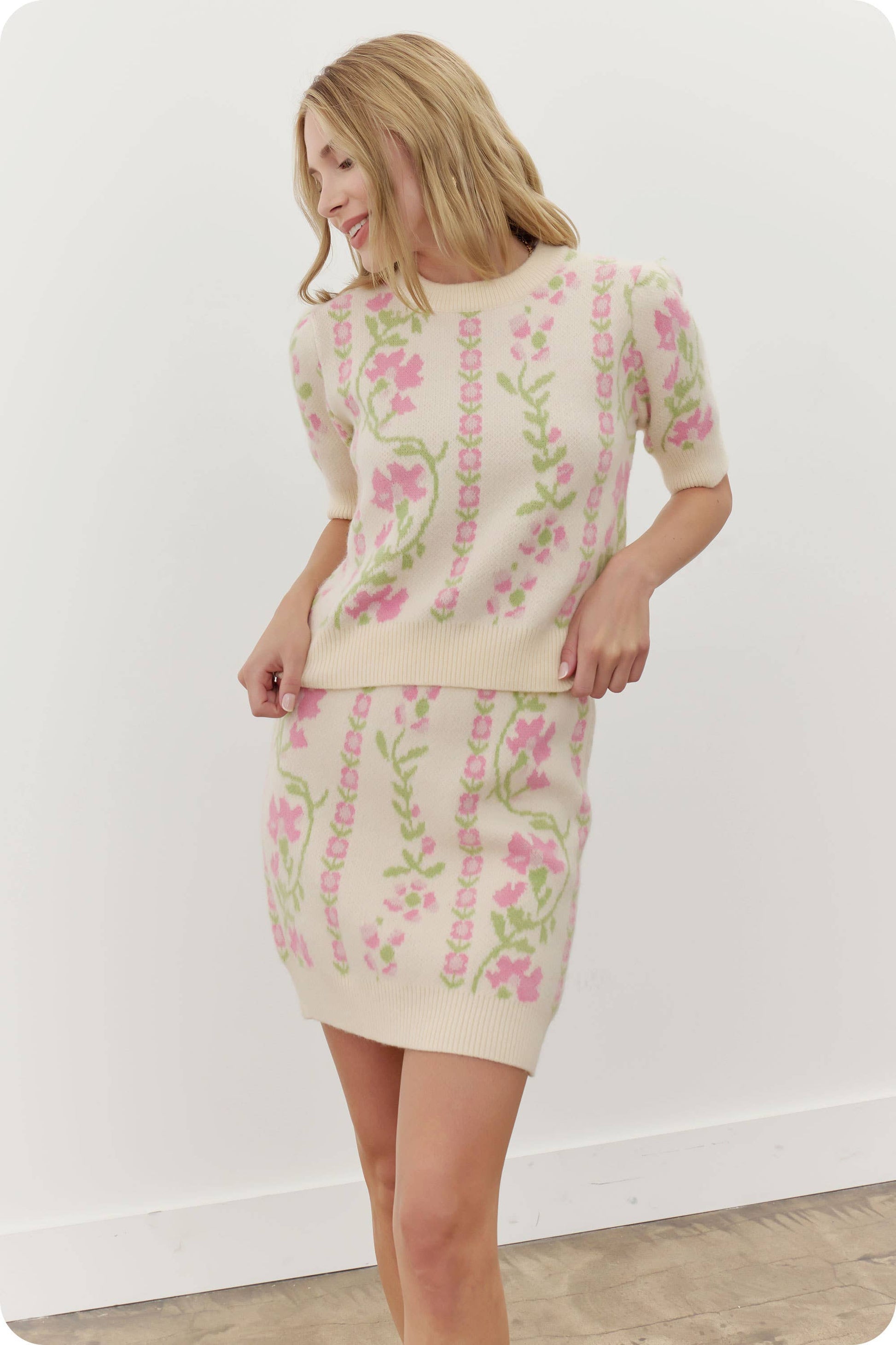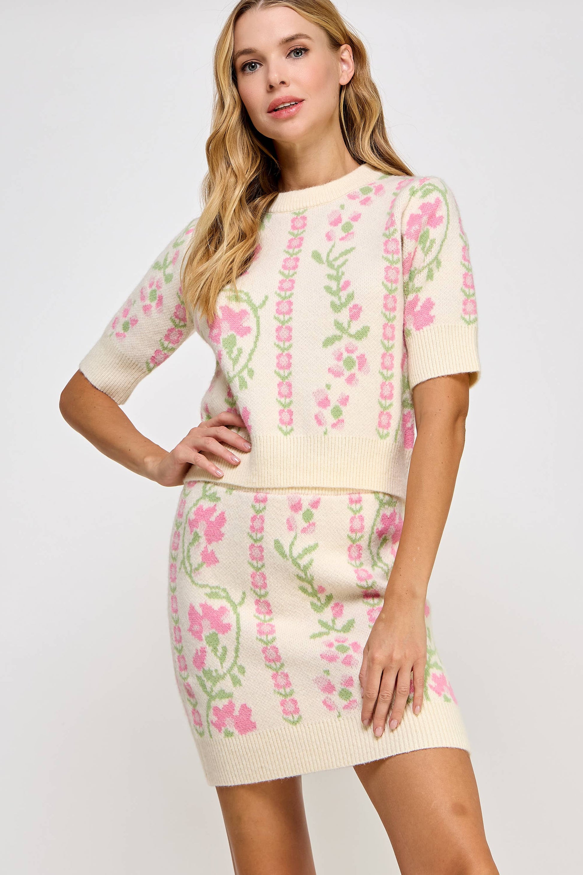 Sweater tee top in soft floral intarsia knit fabric. This style features short sleeve with ribbed cuff, ribbed hem, ribbed round neck, and intarsia floral motif print. It can be made into a set with cardigan JK-4758-H or skirt SK-4760-H
